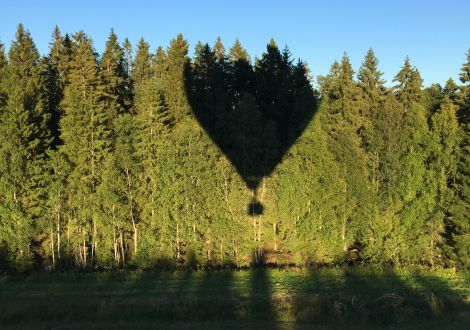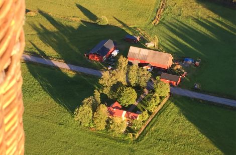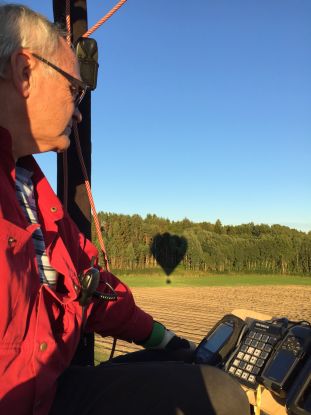 Några meter över backen seglade ballongen sakta över gärdet närmare vägen framför oss där följebilen perfekt stod och väntade.