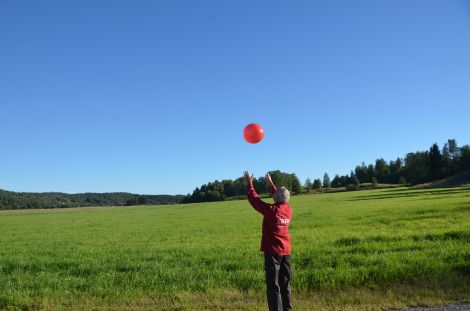 ... Lerdal där Kenneth släppte ytterligare en heliumfylld ballong som skulle visa vindarnas riktning och fart. Tyvärr verkade vindriktningen nu vara mestadels nordlig och då skulle inte Lerdal bli en bra startplats eftersom det riskerade bli mycket skog i närheten där ballongen skulle landa. Vi vill helst ha gott om öppna gärden och ängar vid landning.