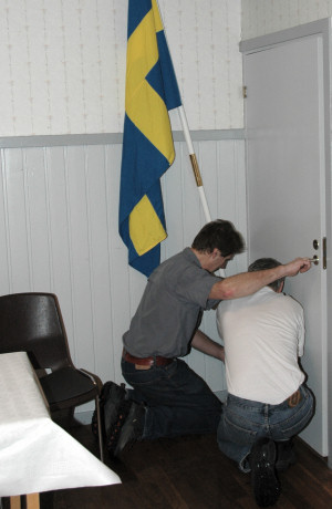 Jubileumsdagen inleddes med att festlokalen, Högsäters bygdegård, smyckades på allahanda sätt. Här är det Roland och Kenneth som monterar upp klubbens fana. Denna har klubben tilldelats av Färgelanda kommun och används varje år vid nationaldagsfirandet.