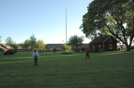 Så blev det dags för alla att följa efter Torp-ballongen som denna kvällen inte blev någon lätt syssla. Svaga vindar gjorde dock att det gick att göra avkopplande avstickare, som här hos Karin och Lole i Mons lummiga trädgård. Ballongen syntes på avstånd över ladugårdstaket. Vindarna varierade också i riktning - först blev det en avstickare bort över Bärby innan ballongen svängde av tillbaka mot Högsäter för att sedan ta sig mot Rännelanda.