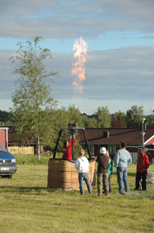 Startplatsen blev i centrala Högsäter och även många intresserade närboende strömmade till för att se ballonger på nära håll. Här görs säkerhetskontroller inför starten och Eva håller på med proveldning.