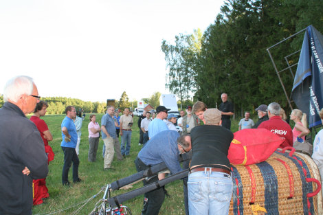Fredagskväll strax utanför Gränna där många flygsugna samlades inför en flygning med 11 ballonger. Lennart "Bullen" Ottosson gav alla intresserade lite grunddata inför flygningen.