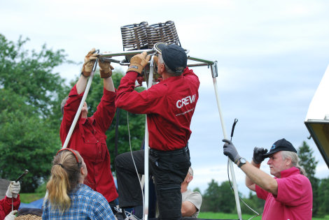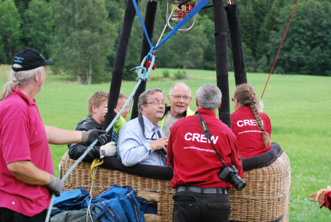 Iris och Gunnar flög snabbt till väders för att rigga färdigt korgen. Och servades rikligt från övriga på marken.
