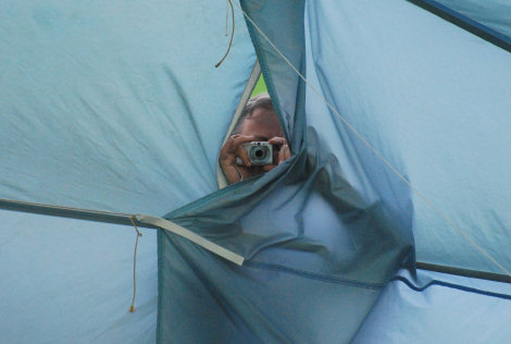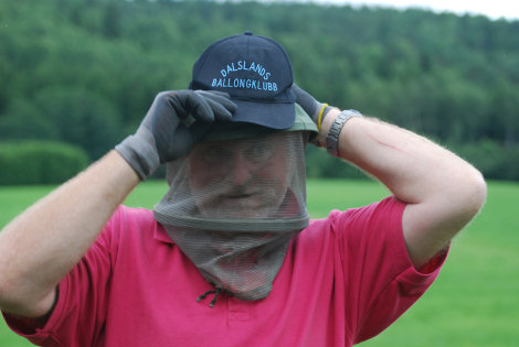 Som förberedelse inför den mängd insekter som brukar dyka upp på kvällarna klädde sig Trevor i dubbla huvudklädnader.