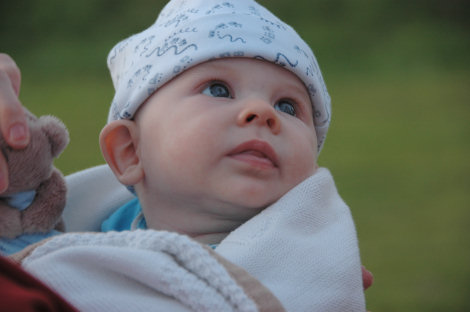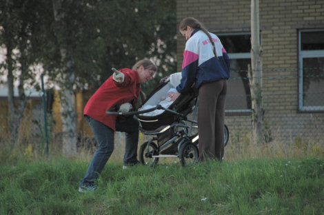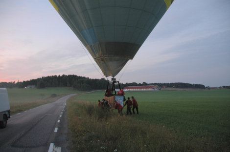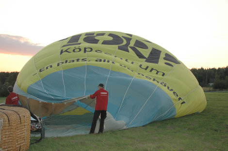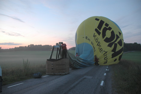 Ballongen packades på vägen och höljet slapp ut i det daggvåta gräset.