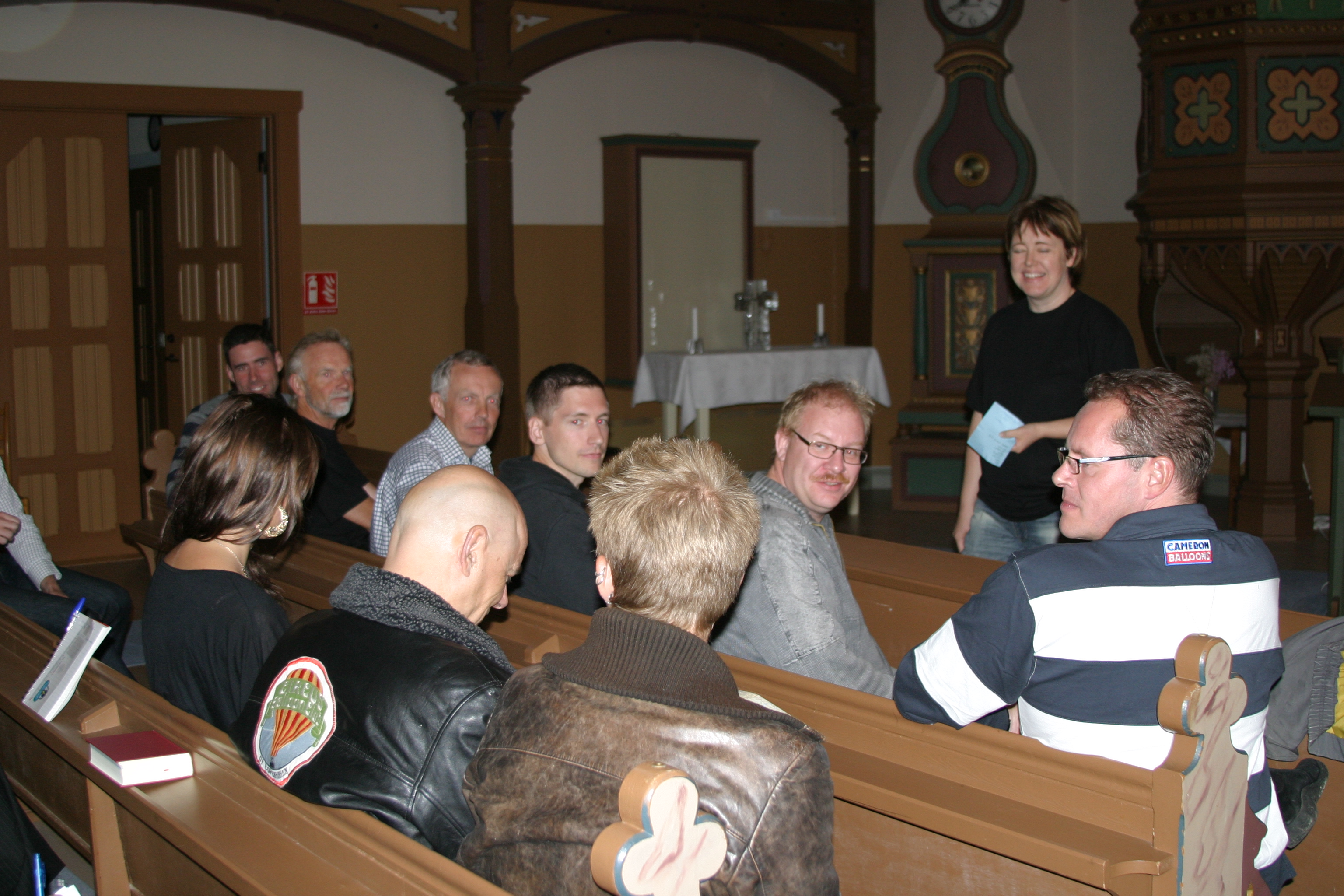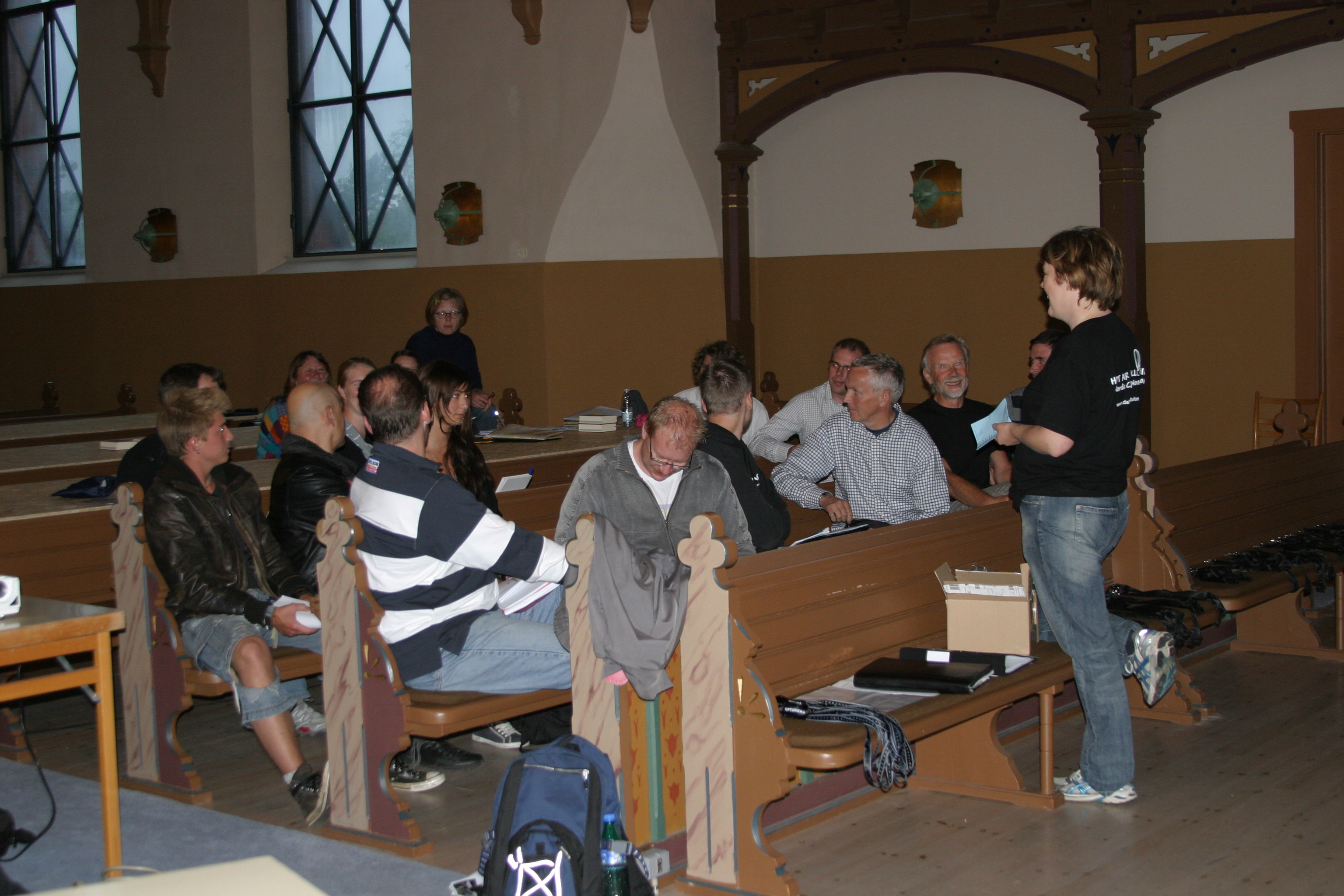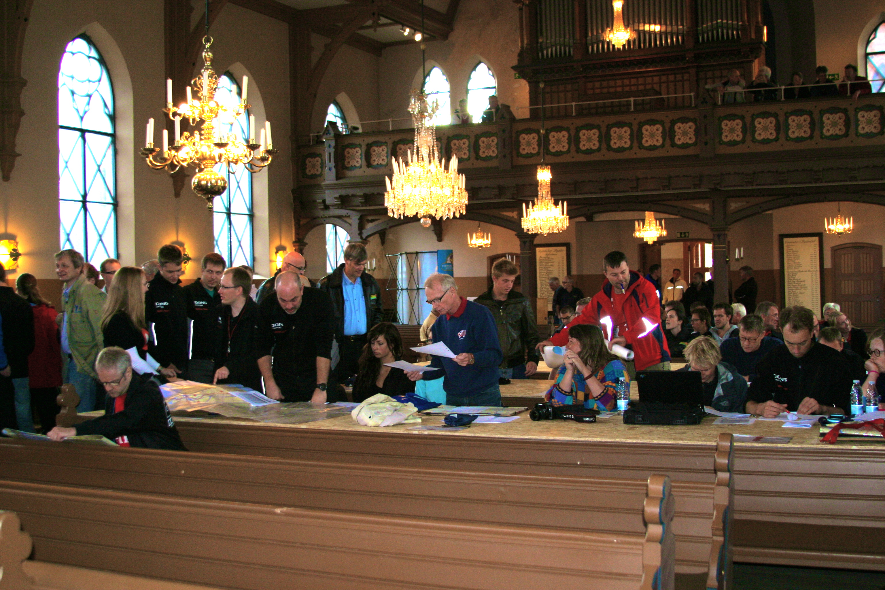 2010-08-24General briefing 2010-08-24 På tisdag kväll kl. 18.00 drog ”General Briefing” igång. Lite speciellt med årets SM/NM är att den officiella briefing lokalen är I Högsäter Kyrka! On Tuseday evening at 18:00 "General Briefing" started. A bit special with this year's SM/NM is that the official briefing room is a place of honor, THE CHURCH! The General Briefing adresses information such as local regulations, competition rules and how to use the GPS Loggers. This year's General Briefing was combined with the opening ceremony of the Nordic Championship, Opening speaker amongst others were President of the city Council Per-Olov Magnusson