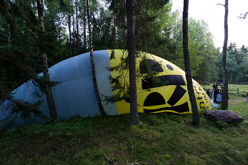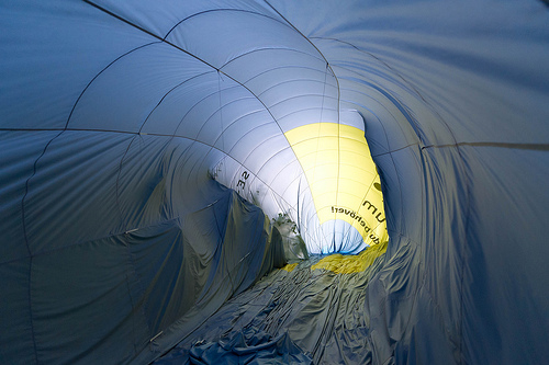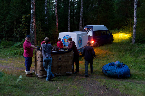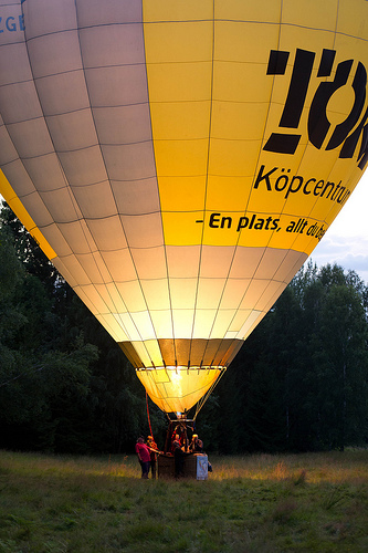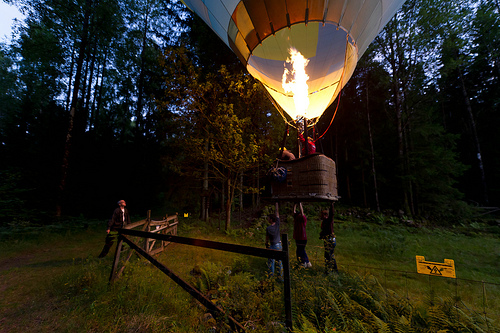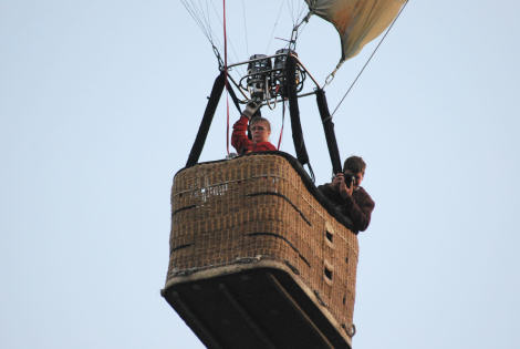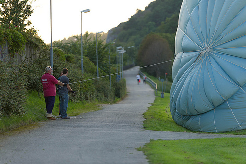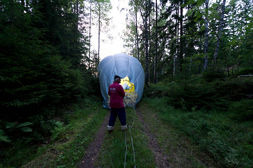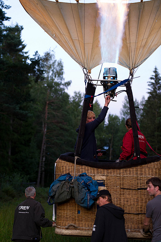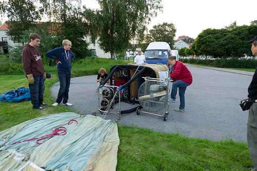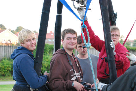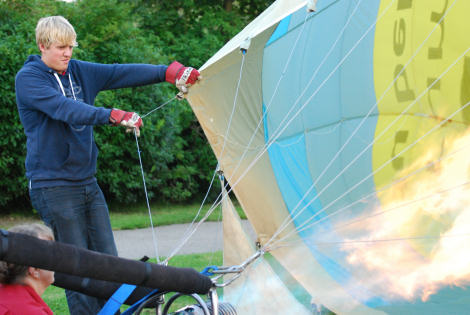 Daniel hjälpte till att hålla ut mynningen så värmen från brännaren kom in i ballonghöljet. Ballongen reste sig upp och ...