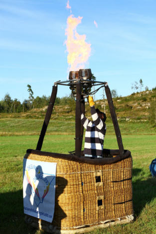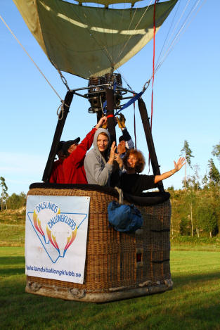 Jonas placerade sig i korgen hos Eva redo att hjälpa till med navigeringen i lufthavet. KJenneth försökte också hålla koll på att allt såg okej ut.