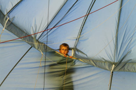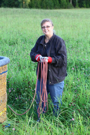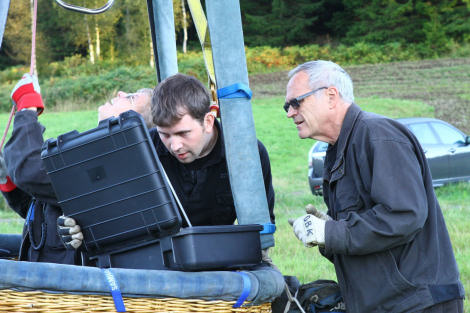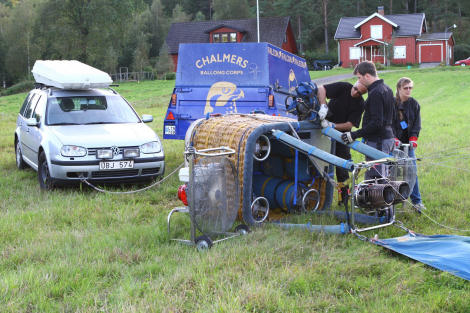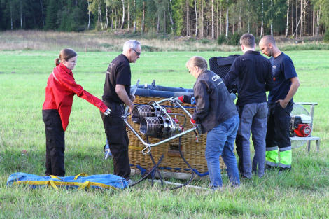 Björn var nu färdig med sina startförberedelser. Ballongen stod upp och Alexander och Trevor skyndade in till ballongkorgen med Kronlinan från toppen av ballongen.
