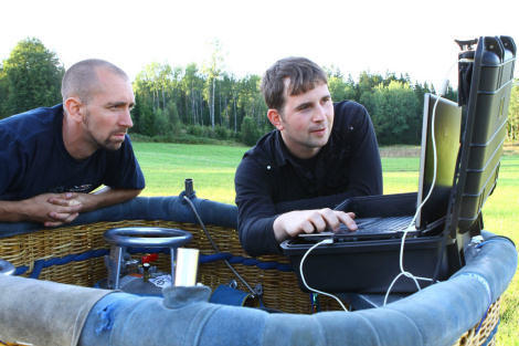 Magnus som lånade ut startplatsen till oss, kollade tillsammans med Jonas på datautrustningen som EM-ballongen skulle ha med upp i luften.