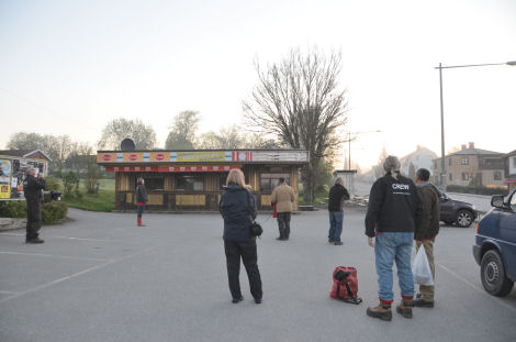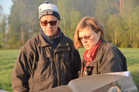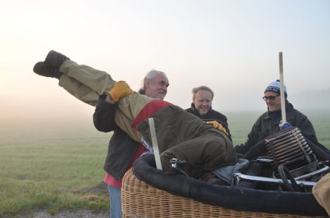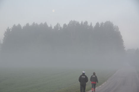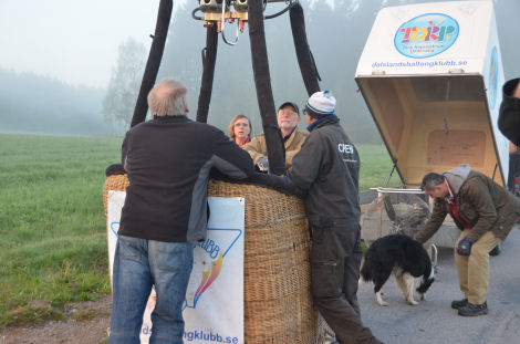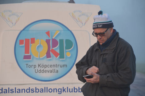 Vid den tänkta startplatsen låg dimman något tätare vid marken och Kenneth och Eva tog sig en promenad för att leta efter bästa stället att packa upp ballongen på.
