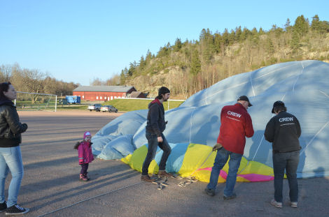 Ballonghöljet plockades fram och började fyllas med luft. Den numera flerfärgade toppen på ballongen inspekterades lite extra.