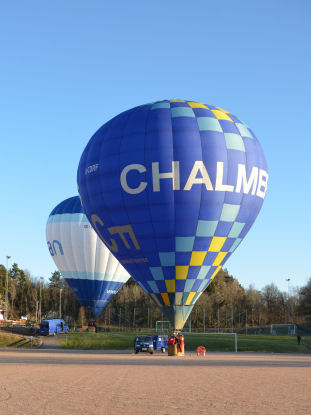 Så startade Eva brännaren och fick in varmluft i ballongen så att den skulle resa sig upp. På bilden syns också Chalmersballongen från Chalmers Ballong Corps (CBC). Totalt var det idag tre ballonger som tänkte sig upp i luften.