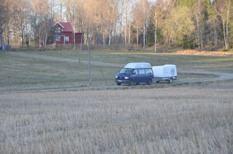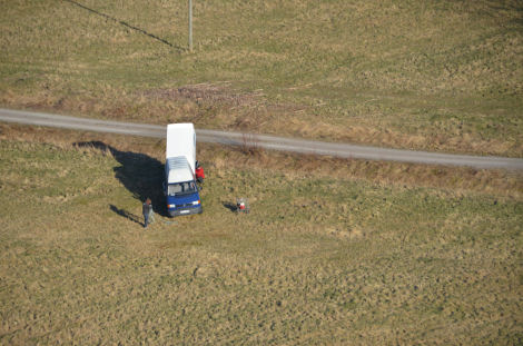 Följebilschauffören var iväg och letade markägare för att tacka för lånet av landningsplats. Tänkte kanske också passa på att fråga om lov att få köra in med bussen på gärdet för att få hämta ballongen? Vi kör aldrig ut på åkrarna utan att ha markägares (brukares) tillstånd.
