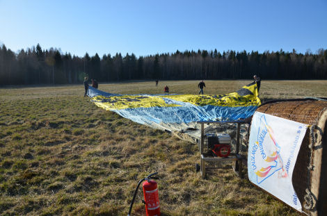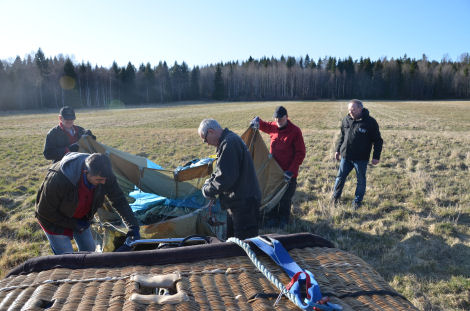 Solig fin kväll för ballongflygning. Denna ballongturen började på ett gärde vid Ekarbol där alla hjälptes åt för att rigga i ordning korg och brännare.