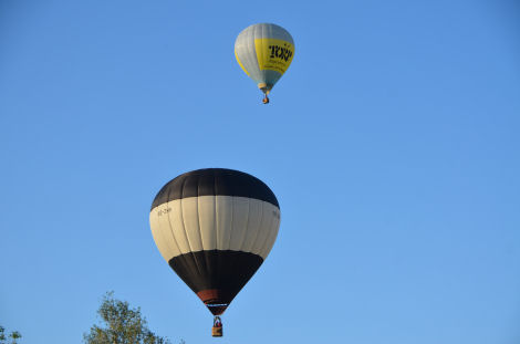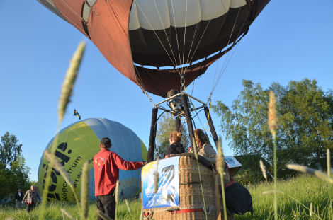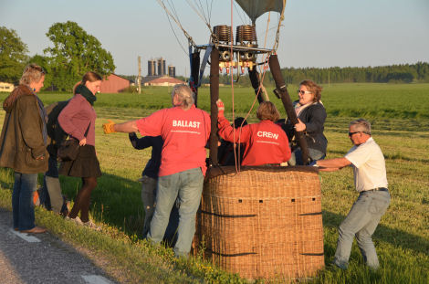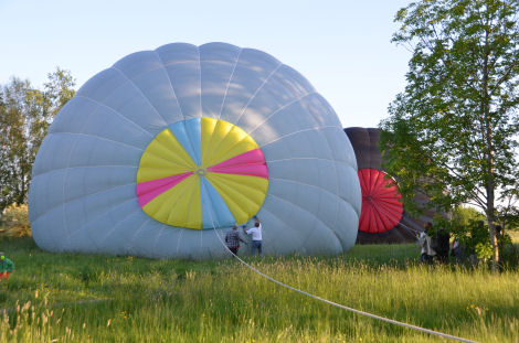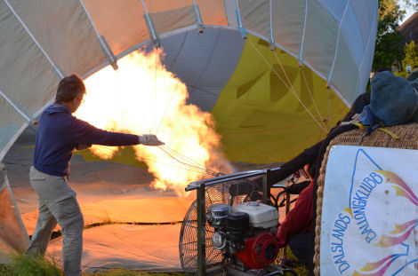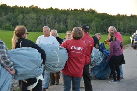Tillsammans med Dalslands ballongklubbs egen blågula ballong låg snart också Svenska Ballongfederationens hyrballong luftfyllda på startplatsen ivriga att få komma upp i luften. Dalslands balloon club's yeallow and blue balloon and Svenska Ballongfederationens rented balloon were soon filled with air and eager to get up in the air.