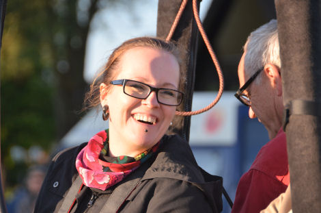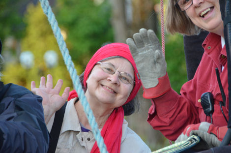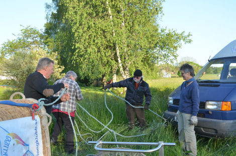 Samtliga hjälpte till efter bästa förmåga och här är det Peter som hjälper till att förankra ballong och buss med ett dubbelt halvslag. Everyone was helping as best they could and here Peter is helping tie down the balloon to the bus.