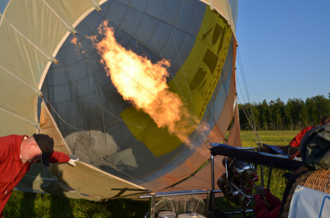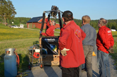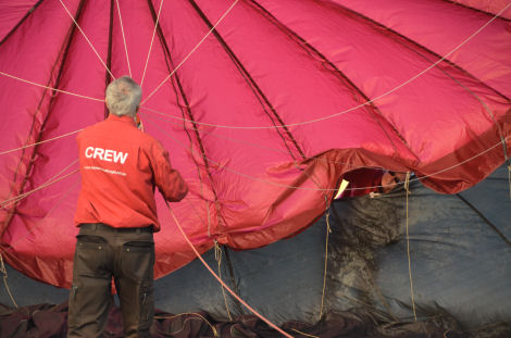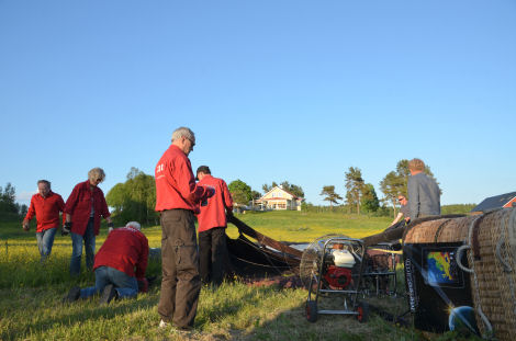 Ballonghöljet fästes vid korgen och började snart fyllas med luft.