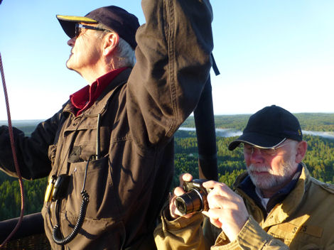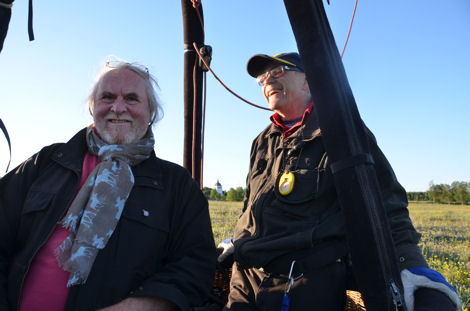 ... stod snart på backen. Trevor och Kenneth såg verkligt glada ut. Kan det ha varit för att de tänkte stanna kvar i korgen och flyga vidare?