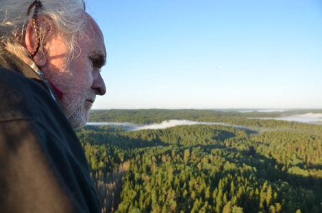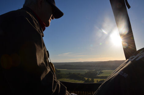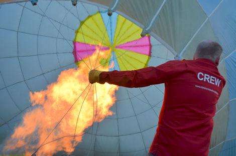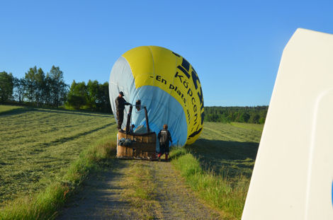 När ballonghöljet låg där trind och välfylld startade Kenneth brännarna som värmde luften så att ballongen reste sig upp. Jörgen hjälpte till att hålla undan vajrar och tyg från eldslågan.