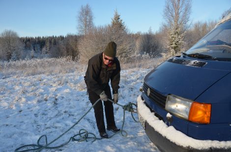 Kenneth förankrade repet mellan bilen och ballongen så att ballongen inte skulle kunna ge sig iväg okontrollerat.