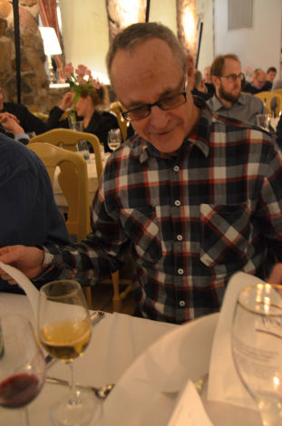 Kvällsaktiviteterna inleddes med middag på Gyllene Uttern. Kenneth med flera runt bordet funderade kring dukningen och alla lager av dukar på bordet.