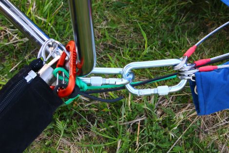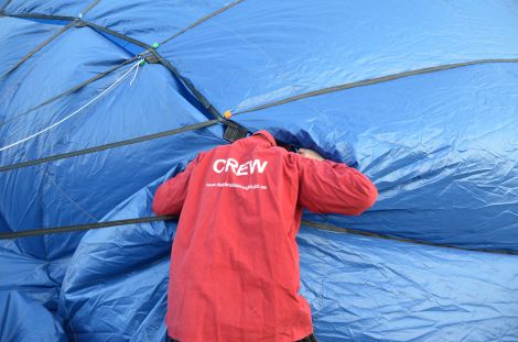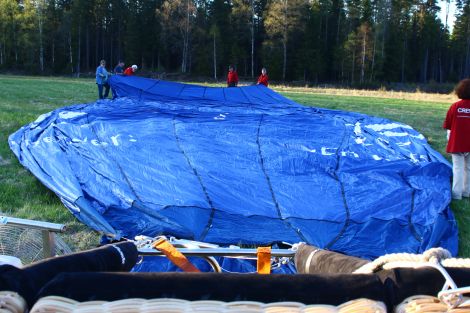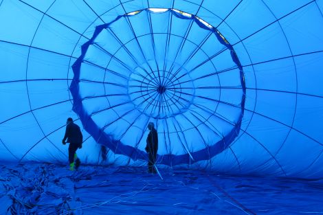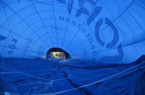 Kenneth tog av sig skorna då han för första gången gick in i ballonghöljet för inspektion. Några extra linor i denna ballongen mot vad vi är vana vid.