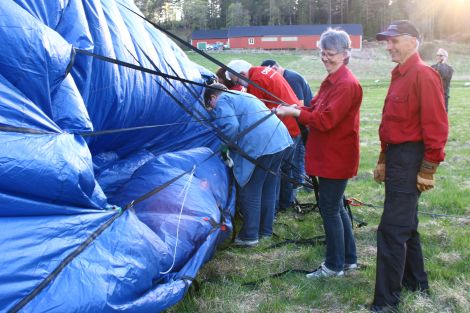 I toppen av ballongen hjälptes man åt att fästa den lösa tygbiten där med kardborrar. Här syns Iris och Gunnars glada miner och mungiporna verkar vara uppåt på alla som är med.
