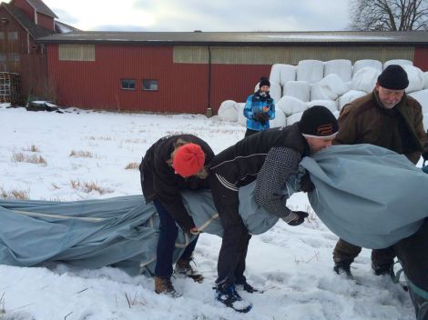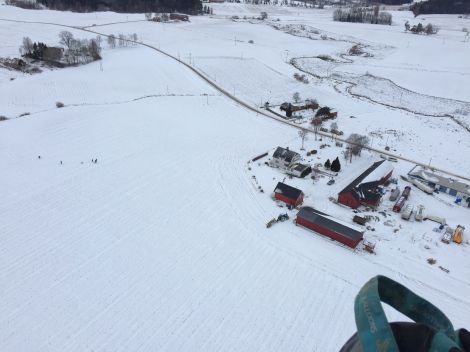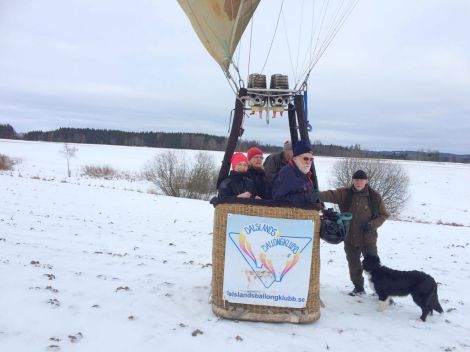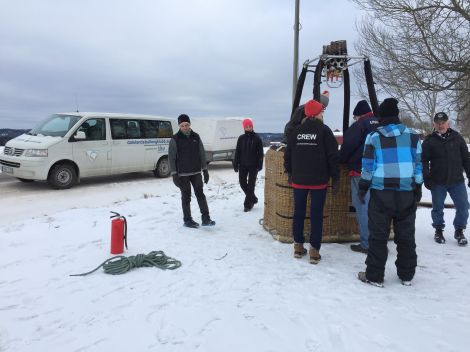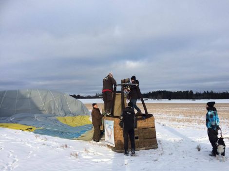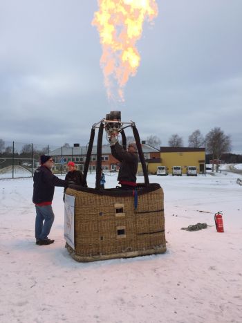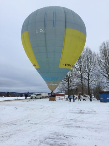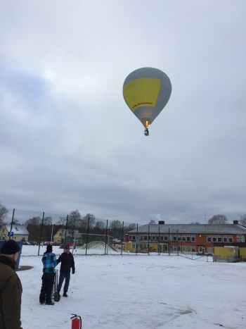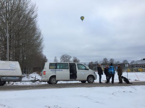 Någon minusgrad, lugna vindar och tillräckligt högt i tak för molnen så vi skulle kunna flyga idag. Vindriktningen skulle vara rakt västerut så att starta i Järbo verkade vettigt för att sedan kunna ha gott om landningsplatser att välja på efter en stund i luften. På parkeringen intill Järbo friskola började ballongens delar att riggas samman.