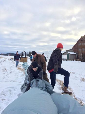 Invid den intilliggande ladugården började ballongen packas ihop.