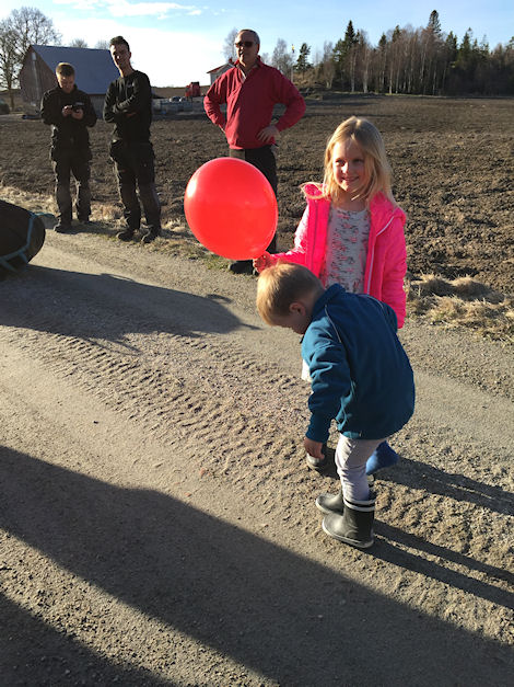 Storasyskonen Astrid och Melker hjälpte till att släppa iväg kvällens andra väderballong. En vanlig heliumfylld ballong som på sin färd uppåt visar vindarnas riktning och fart. Idag såg det ut som vi skulle få en flygning nordvästut.