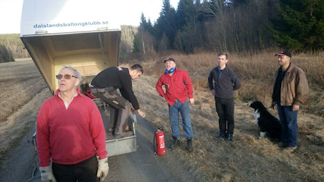 Samling på torget i Högsäter och planering inför flygning i närområdet. Mitt i bild ses Roland och Gunilla som vunnit vårt Markägarlotteri och nu var förväntansfulla inför sin första ballongflygning. Varje år lottar vi vid årsmötet ut flygning för två personer bland de markägare som är snälla och lånar ut sin mark till oss vid start och landning. Utan dessa markägare skulle vi inte kunna utöva ballongflygningen.