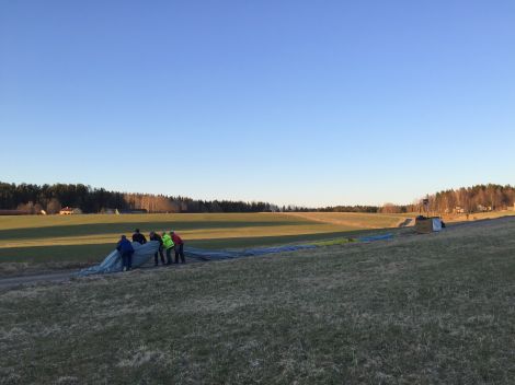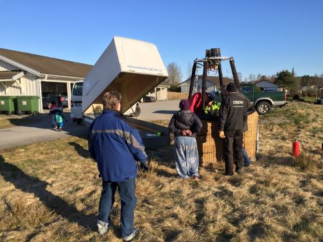 På Birgers gärde i Östby landade ballongen och på vägen intill gärdet packades ballongen snabbt tillbaka i släpkärran.