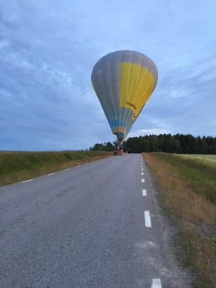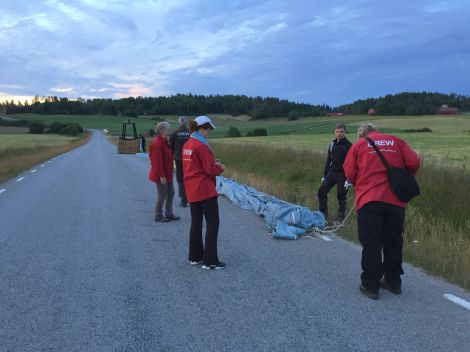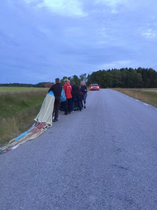Intill Edstena förväntades att ballongen kanske skulle komma ner för landning. Det hade nu inte bra blivit ett följe av två följebilar som utökats med ytterligare en bil med ballongintresserade i samt en hund med matte i kopplet.