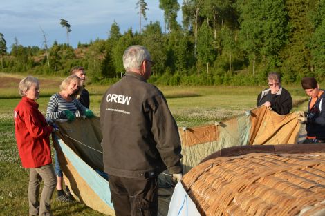 Man hjälptes också åt att hålla upp mynningen på ballonghöljet så att det skulle gå lättare för Kenneth att fästa vajrarna från höljet i ballongkorgen.