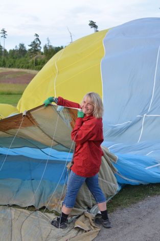 Fläkten startades och Maud var med och höll upp mynningen på tyget så att ballonghöljet fortare kunde fyllas.