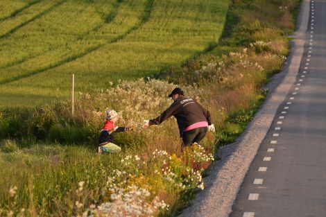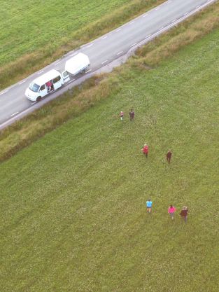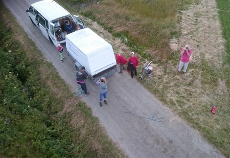 Från marken fotades och ropades hej då, samt packades in förankringsrep med mera i släpkärran. Så började följebilarnas uppgift att på farbara vägar hålla sig nära ballongen. Men helst något framför för att kunna rapportera om djur eller ledningar i närheten. Uppifrån ballongen kan det också vara svårt att se vilken gröda det är på gärdena så då är det perfekt med spejare i följebilen. Sedan är det helt klart en extra utmaning att varje gång finnas före ballongen vid landningsplatsen och ta emot ballongen.
