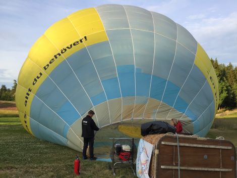 Det blev dags för Kenneth att tända brännarna och värma luften i ballonghöljet så att ballongen reste sig upp.