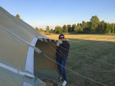Ballonghöljet kopplades till ballongkorgen och började fyllas med luft. Rita hjälpte till att hålla upp mynningen.