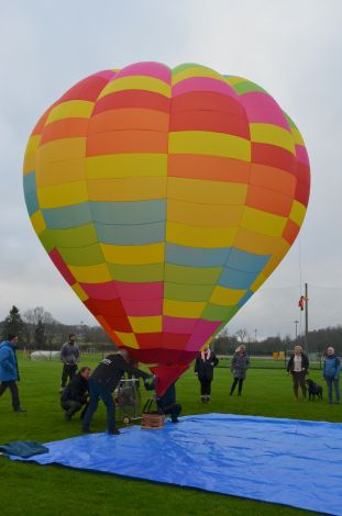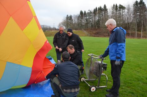Ballonghöljet började fyllas med luft. I toppen på den lilla ballongen finns inte en parachute (toppventil i tyget som man kan öppna) som vi är vana vid på de stora luftballongerna.