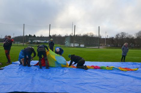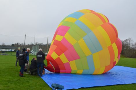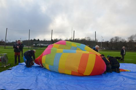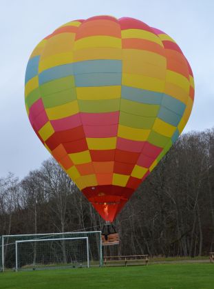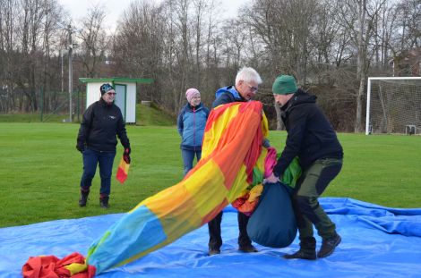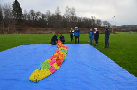 ... fotbollsplanerna i Högsäter. För säkerhets skull bredde vi först ut en presenning på marken så att det färgglada ballonghöljet skulle slippa bli blött i gräset.