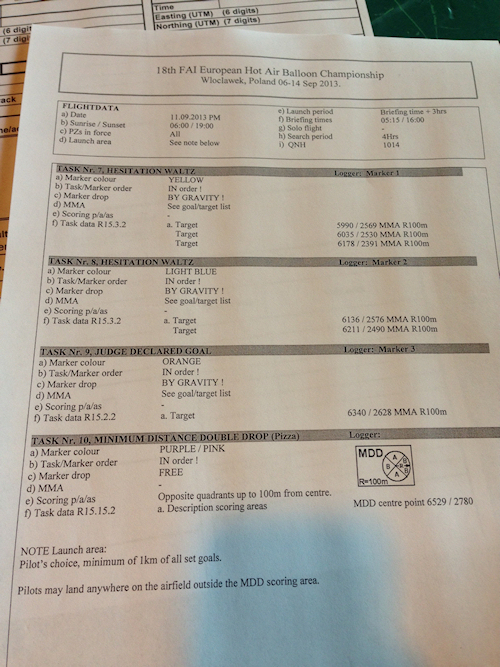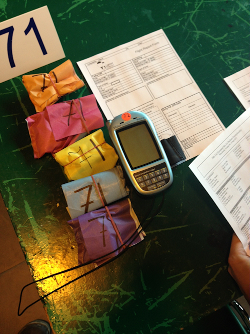 2013-08-07, klockan 23.20 Nu har tävlingsledningen att göra med tyda trackar från loggern (varje ballong loggar sin flygnig) och observatörernas anteckningar. Vi går och lägger oss under tiden inför morgonens briefing. Det skall dock regna i natt - hoppas att det upphör snabbt! /Susanne
