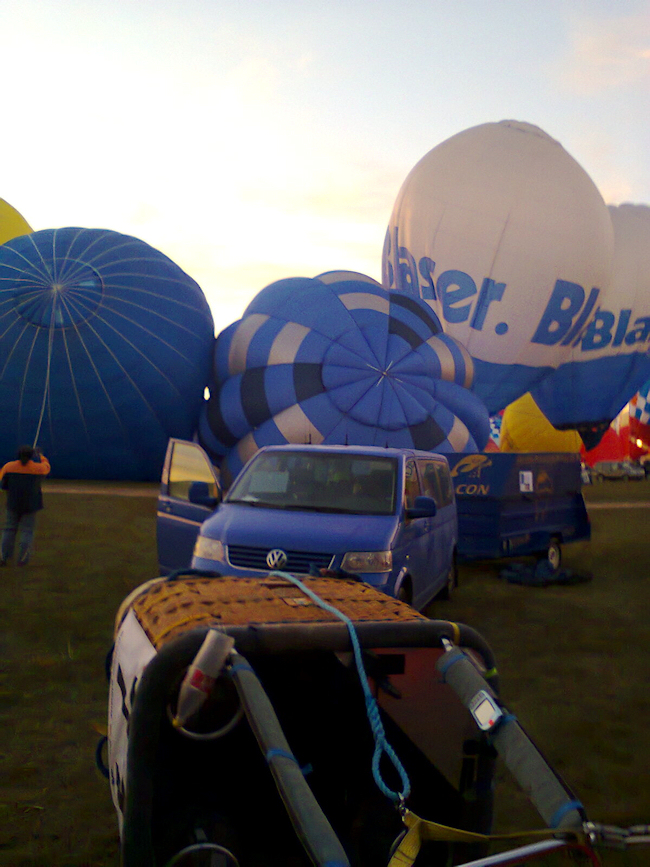 Måndag 9/9 kl 09:09 Puh första flygningen är avklarad, 2:a frukosten uppäten och snart är det sovdags. Morgonen bjöd på friska vindar, riktiga friska vindar. 3 deltävlingar klarades av på en kvart. På mindre tid än timme efter startperiodens början var ballongen packad, utburen från fältet och lastad i släpet. Enligt uppgift 55 km / h på cirka 800 ft verkar varit högsta hastigheten. I bilen konstaterade Markus efter en snabb utkörning från fältet, "han droppar på första målet om 2 minuter, vi hinner inte dit". Det är knappt vi har sett vår ballong efter start. Men körde man 50 km / h på grusvägar som gick parallellt med vindriktningen kunde man köra om ballongerna. /Björn