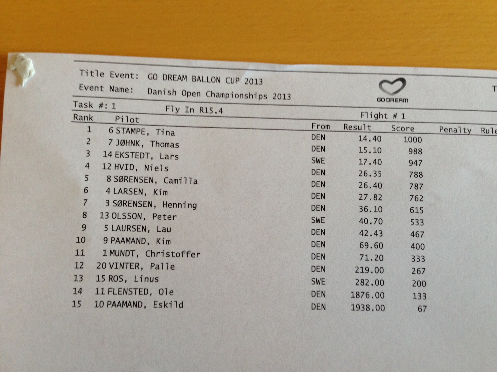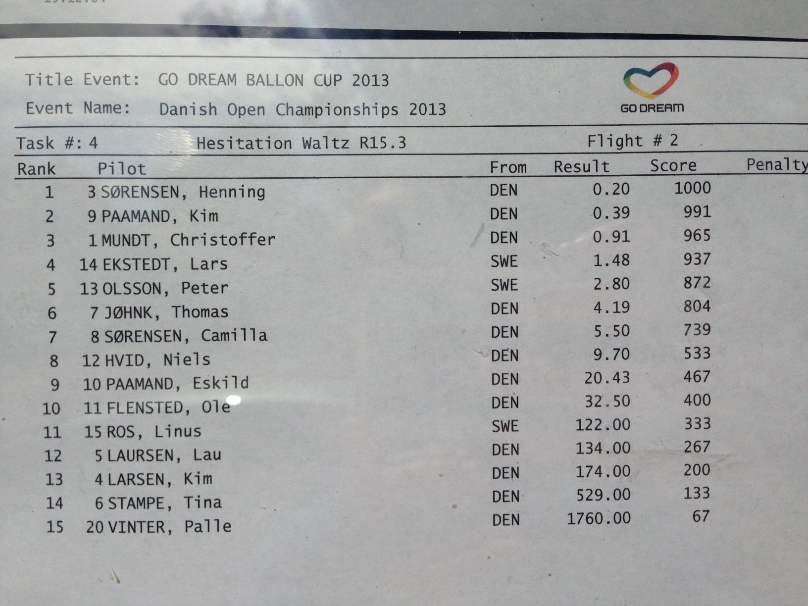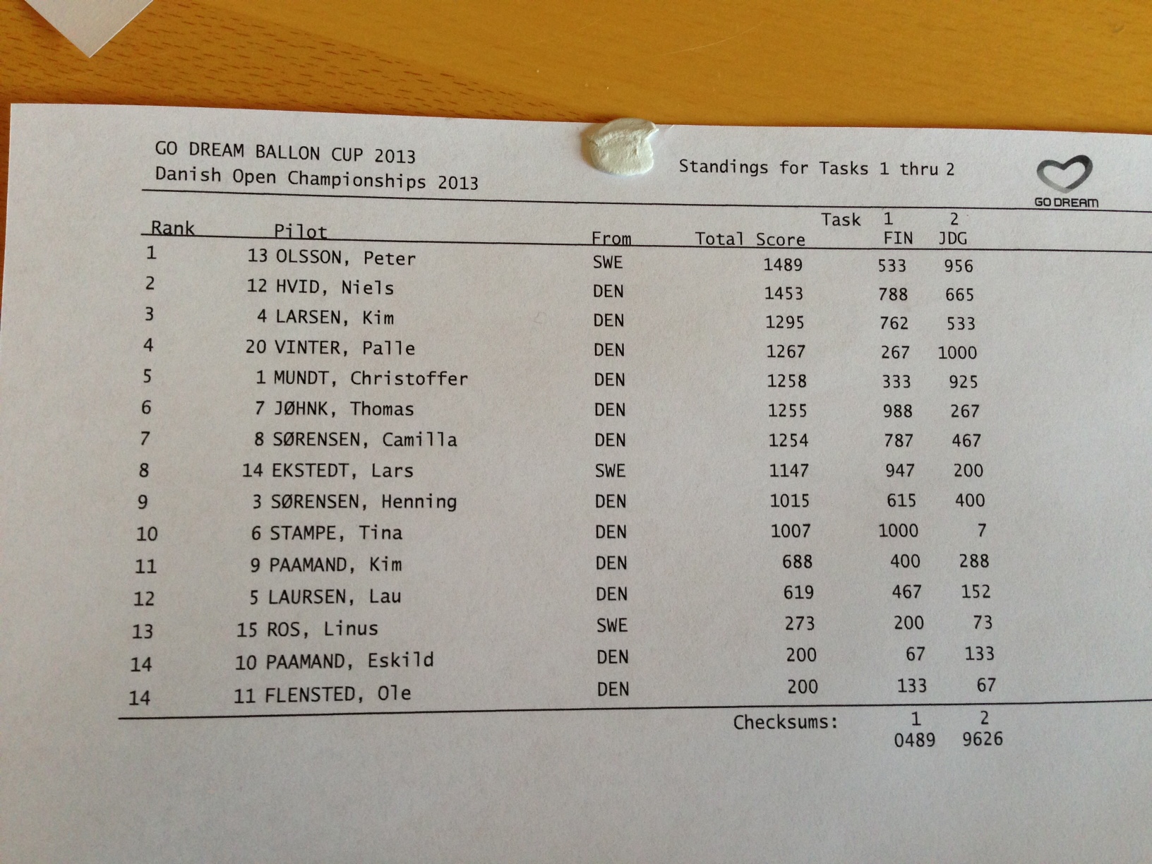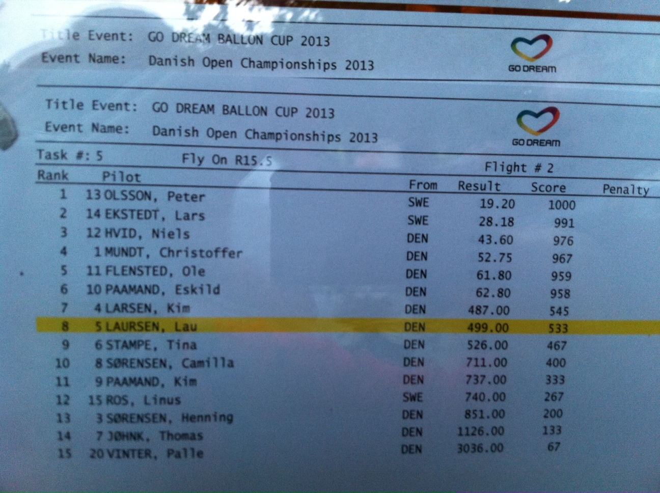 6-11 augusti 2013 genomfördes Danska mästerskapen och då tre svenska lag deltog blev det också Danska öppna mästerskapen. Tävlingscentrum var Dazy semesteranläggning utanför Silkeborg ett väldigt vackert landskap med kullar, grönska och vatten. Tävlingsledare var Dave Morgan och Brenda ett radarpar som varit med under DM i många år. De svenska lagen var lag Peter Olsson, lag Lars Ekstedt samt lag Linus Ros. Lag Peter och Lars passade på och övade inför EM som avgörs i september. Tre flygningar kunde genomföras under veckan då vädret bjöd på både för mycket blåst och regn. Det blev en spännande tävling då det skilde få poäng mellan de tävlande. Dansk mästare blev Niels Hvid, tvåa Christoffer Mundt och trea Kim Larsen. Vinnare av öppna danska mästerskapen blev Peter Olsson, sexa Lars Ekstedt och fjortonde Linus Ros. Under veckan skrevs det dagbok och det kommer fler bilder. Under tiden kan du se arrangörernas bilder och text. Dagbok från Danmark