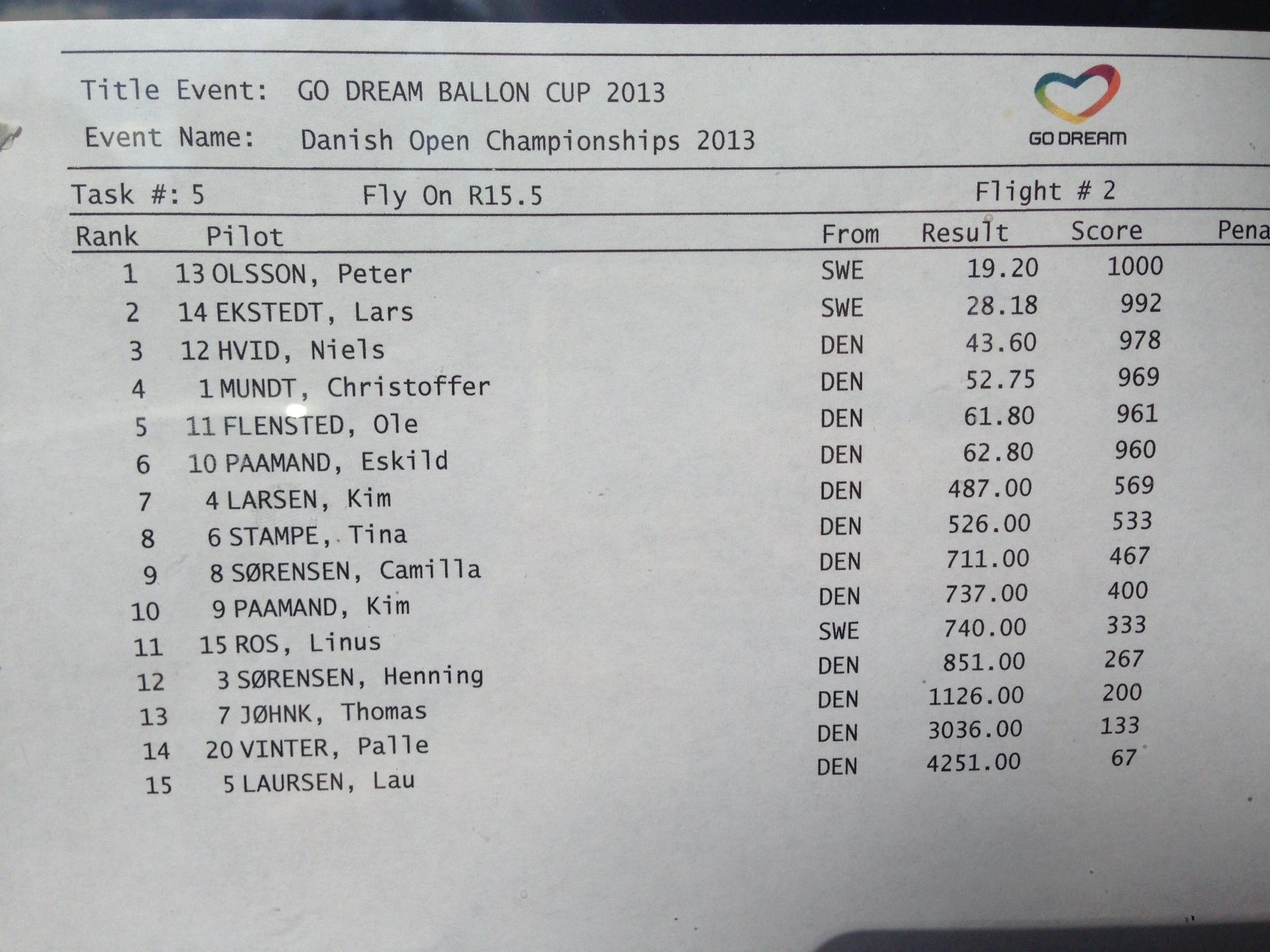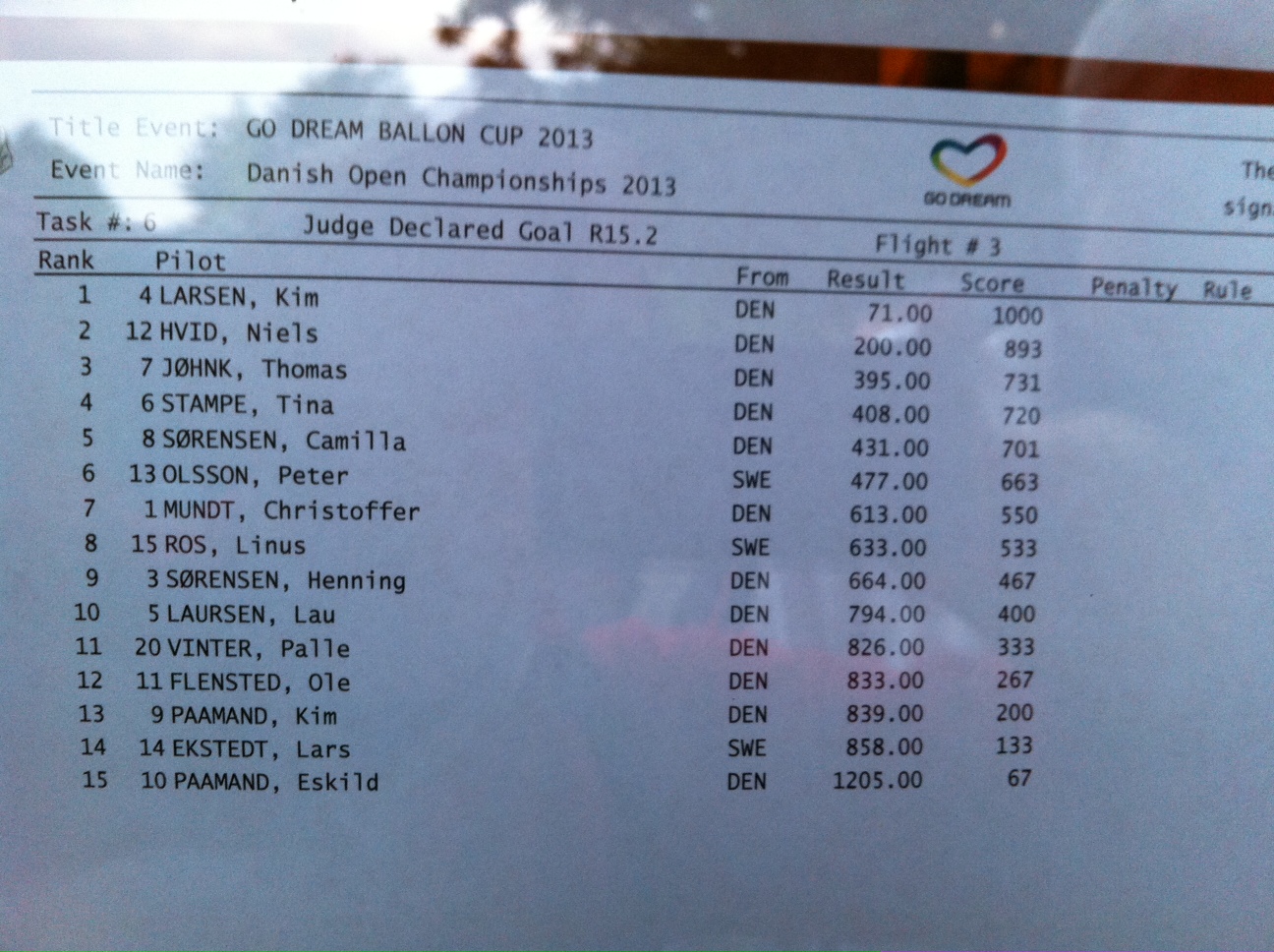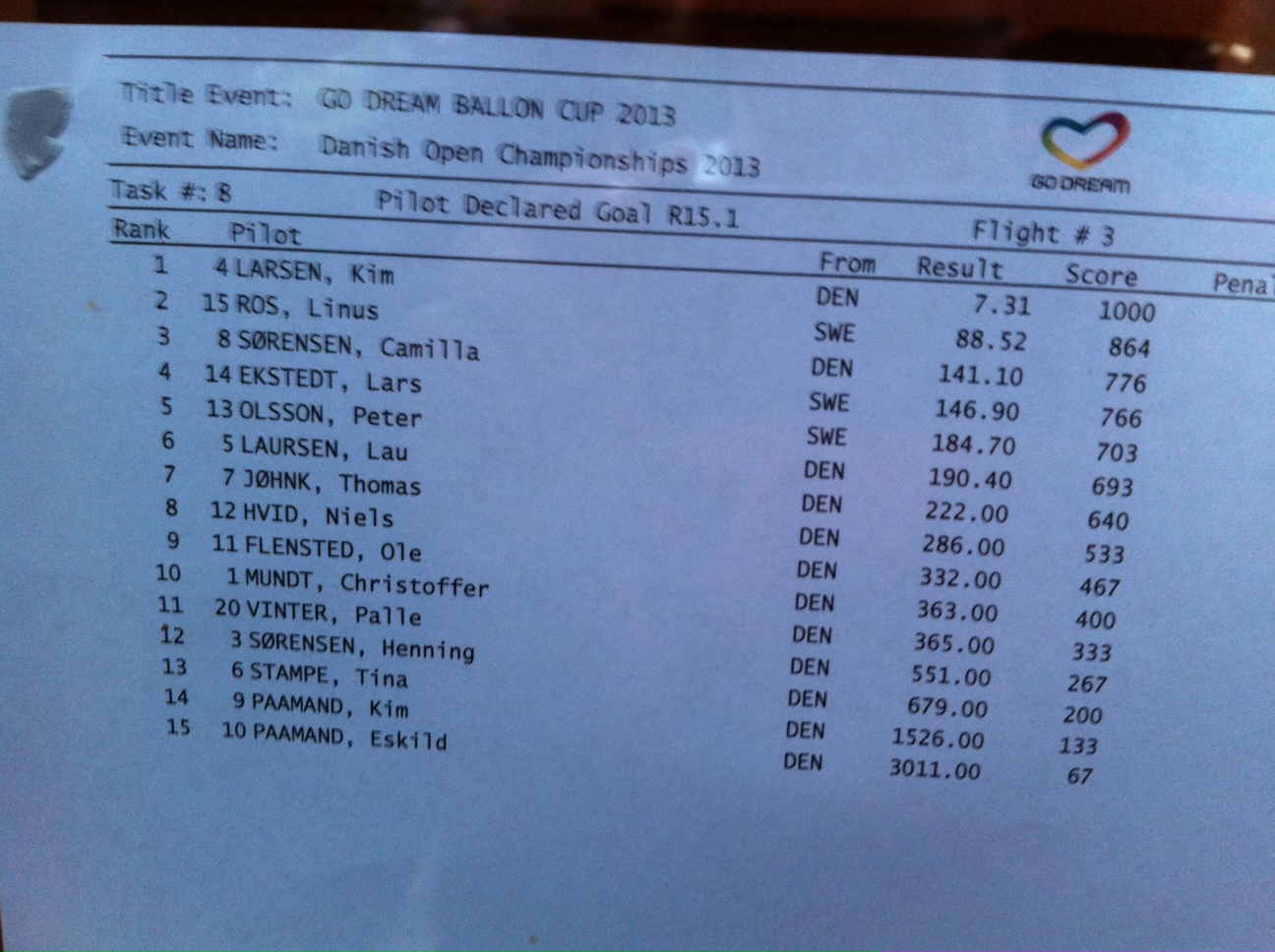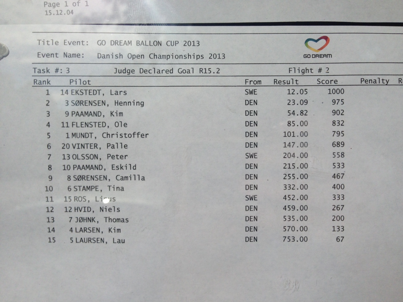 Fredag 13/9 (sista flygdagen) kl. 8.30 Just nu efter 13 deltävlingar är Peter på plats 13, Lars 45 och Simon 50. Vår danske vän Christoffer Mundt har klättrat upp till 8:e plats. Leder gör nu Stefan Zeberu, SUI.
