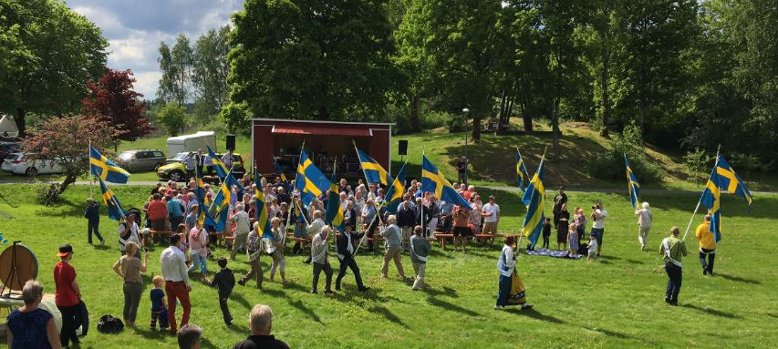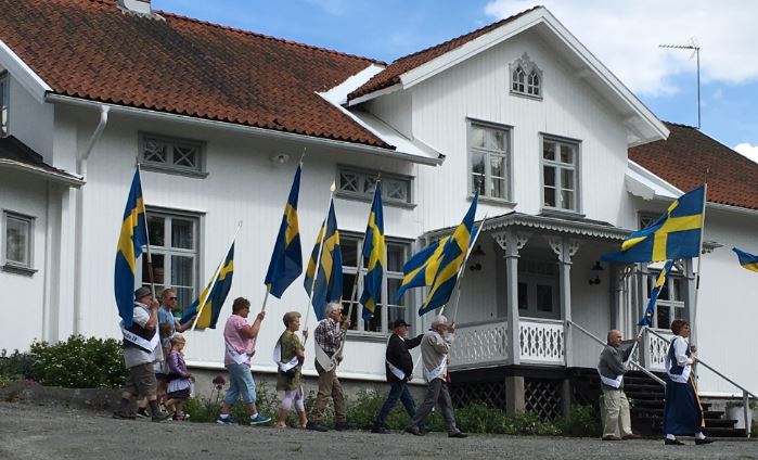 Tågar förbi Stigens herrgård ner till den sommargröna trädgården. Vinden fångade flaggorna under paraden. Utöver flaggspelet bjöds det på musik och utdelning av priser, innan firandet avslutades med nationalsången och ett fyrfaldigt hurra! Social afton 5 juni 2017